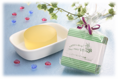 蜂蜜の持つ保湿力、お肌の栄養になるローヤルゼリー、プロポリスの殺菌効果、お肌に潤いを与えるコラーゲン、贅沢に材料にこだわり、自然のものから作り出したお肌にやさしい弱酸性石鹸です。